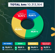 Actualmente, del total de 10.313,164 kilómetros, el 15 % está en estado muy bueno, el 38 % en buen estado, el 30 % en estado regular, y en el 16,75 % se deberá circular con precaución. Para más información sobre el estado vial y posibles rutas alternas, la ciudadanía podrá visitar la web del Ministerio de Transporte y Obras Publicas: https://bit.ly/3zCcd59.