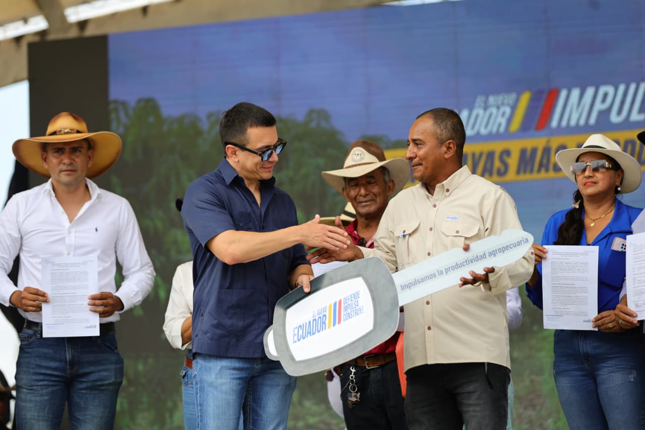 Daule, Guayas. El presidente de la República, Daniel Noboa Azin, lideró este 14 de octubre la entrega de recursos económicos, documentos legales y maquinaria agrícola a comunidades de Daule, en la provincia del Guayas. El acto reafirmó el compromiso del Gobierno Nacional con el desarrollo y fortalecimiento de los pueblos y nacionalidades del país.