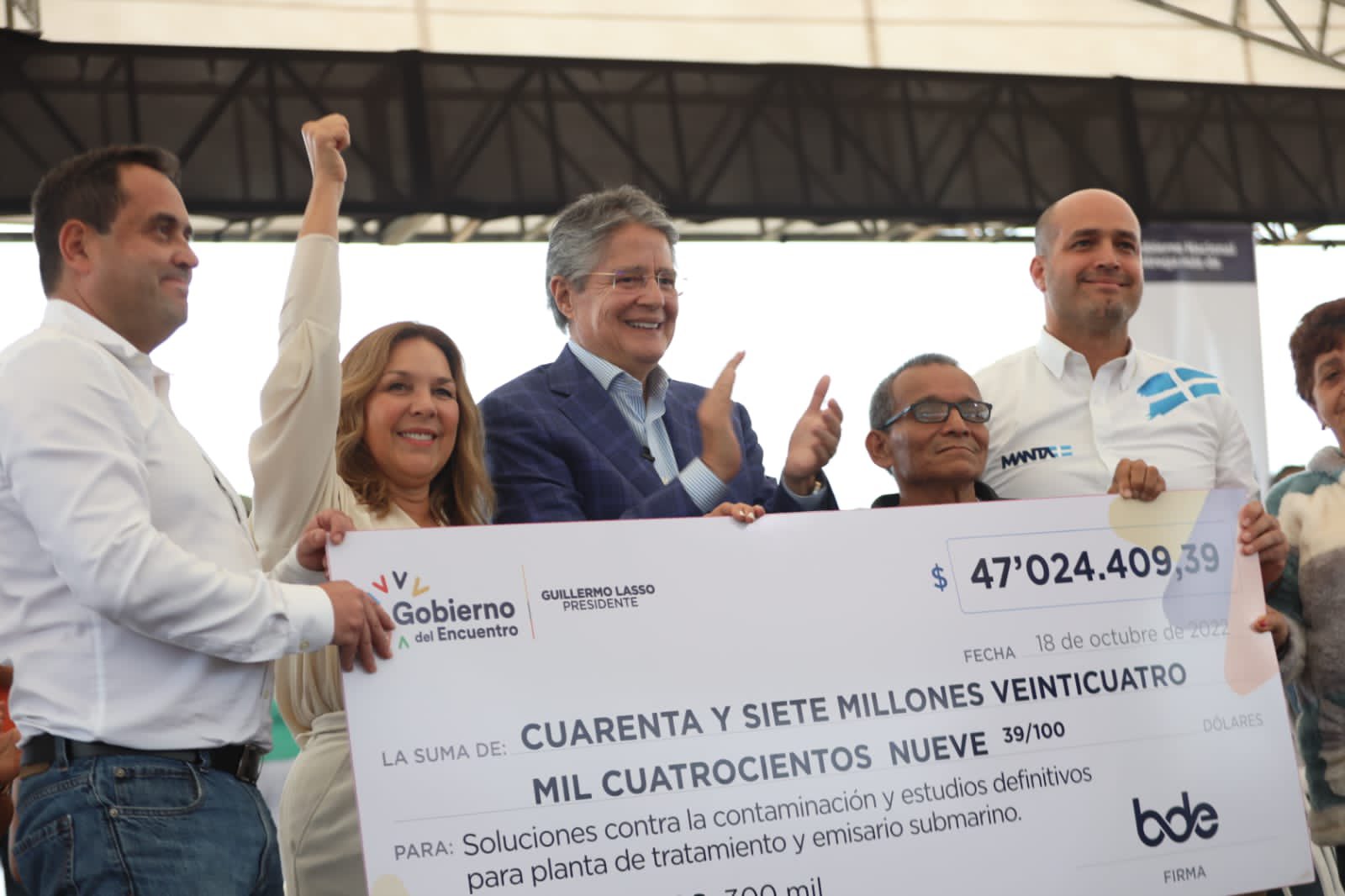 El Mandatario anunció que el Gobierno, por medio del BDE, entregará USD 47 millones para que se puedan ejecutar proyectos en favor de la población de esta ciudad: rehabilitación, construcción y repotenciación de los sistemas hidrosanitarios y obras complementarias de la Ciudadela Manta Beach; estudios, diagnósticos y diseños definitivos del tratamiento y disposición final de las aguas residuales en Manta; y construcción del sistema hidrosanitario y obras complementarias para la recuperación del borde costero.