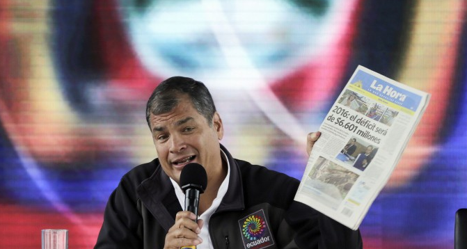 Quito (Pichincha).-El Presidente de la República, Rafael Correa, se refirió a las críticas de la prensa y la oposición que destacan el déficit que tendría el Gobierno en el presupuesto de 2016. Ahí puntualizó el caso de diario La Hora que publicó en su portada que el déficit sería de 6601 millones de dólares.