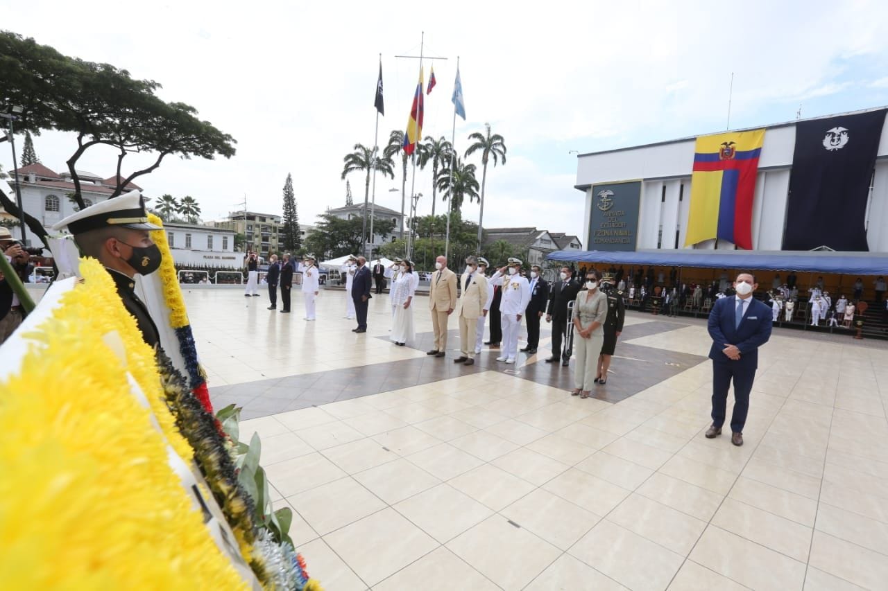 Guayaquil, Guayas. El reconocimiento a la Armada Nacional en su labor de proteger y vigilar la soberanía de los espacios marítimos de Ecuador y su compromiso de permanecer en primera línea en la lucha contra el COVID-19, fueron destacados por el presidente de la República, Guillermo Lasso, durante la Ceremonia Conmemorativa por los 80 años del Combate Naval de «Jambelí» y día de las glorias navales de la Armada del Ecuador, desarrollada esta mañana en la Perla del Pacífico.